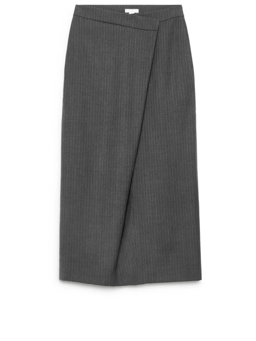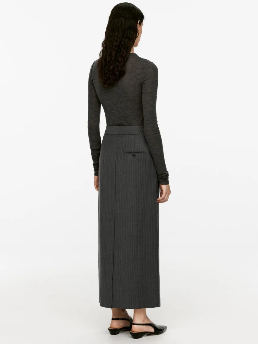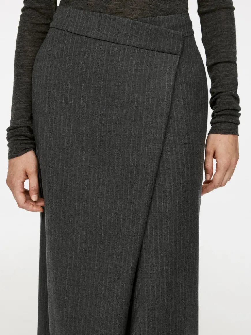 Pencil skirt with fake wrap closure. Hook-and-bar fastening with zip at front. Welt pocket with button closure at back. High waist.