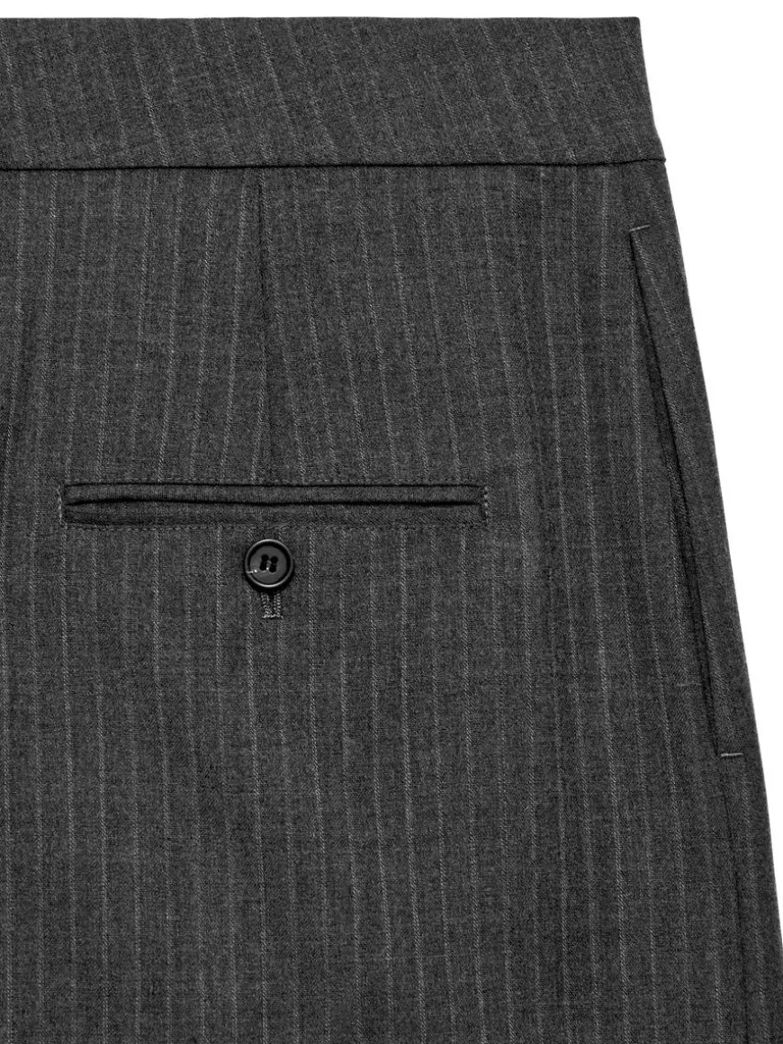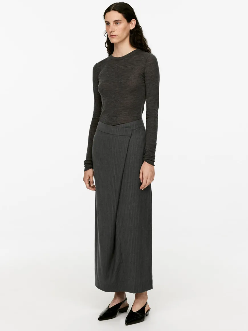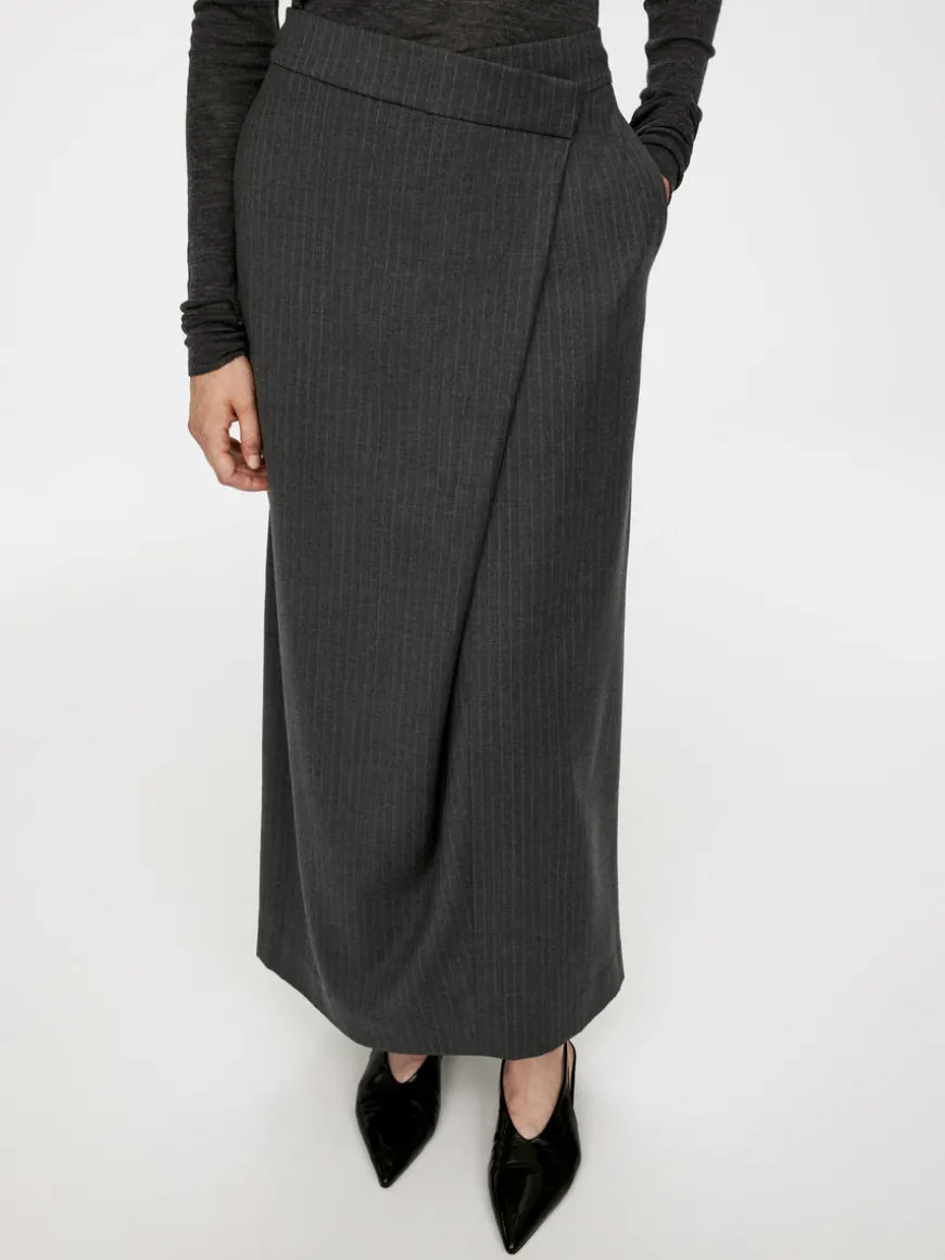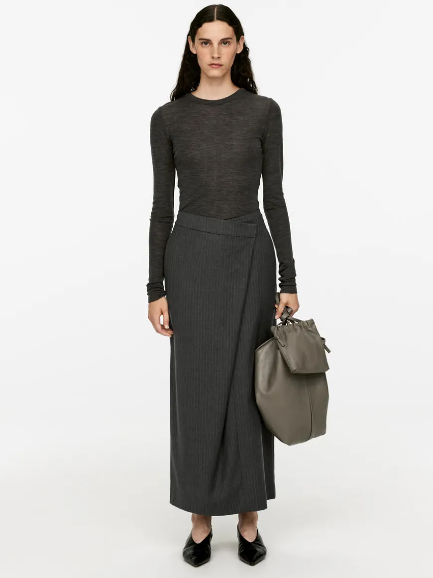 Pencil skirt with fake wrap closure. Hook-and-bar fastening with zip at front. Welt pocket with button closure at back. High waist.